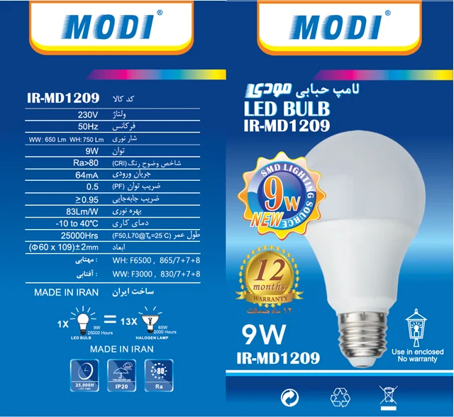 چراغ حبابی ۹ وات برند مودی با ۱۲ ماه گارانتی